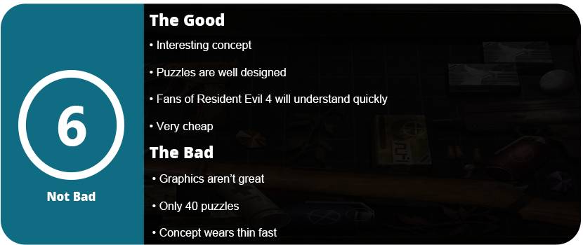 This sounds like a great concept, but in the end, it gets old really fast and it makes you just want to play RE4 instead. The visuals are pretty ugly, there’s a single track that loops in the background, and that’s all there is to this. For the low asking price, I can’t really complain. I had my hour of fun, but it’s totally forgettable. This isn’t on the same level as Portal or even something like The Room series. You won’t be talking about this 10 years from now. I honestly can only recommend this to RE4 fans who want some sort of weird spin-off. Anyone else who never played RE4 just won’t care about this or even get the idea.