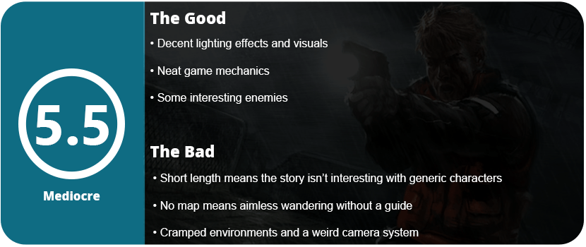 There is a lot of environmental damage that can be done, such as shooting barrels, fire extinguishers, and valves on walls and shooting some electrical boxes to electrocute enemies in water. There were even a couple of scenes in which you extend a bridge, and if you think ahead, you can have the zombies fall off by pulling the bridge back. These were fun mechanics, but they aren’t utilized frequently. The very cramped and small rooms are difficult to maneuver and fight in. The camera switches to an over-the-shoulder perspective reminiscent of Resident Evil 4 when aiming, but it snaps back to a pulled-back third-person view and occasionally switches to fixed camera angles. It’s disorienting, and while not game-breaking, it wasn’t ideal for this much action. The later Exocel enemies are more interesting to fight, such as the Exoshade, which is invisible in shadows; there is one that’s invisible all the time, and you must watch for wet footprints, or it will be visible when passing through steam. The Exomass, resembling a bull, stands as the most formidable opponent in the game. The only way to kill it is by shooting its red club-like arm until it explodes. You need to utilize each weapon for each situation, such as the AK for long distance and everything else for close quarters, with the shotgun being the best weapon. Each of the game’s two sections (the ship and the oil rig/research facility) has two restock rooms and a limited medbay. You can’t restock forever.
