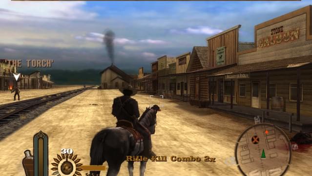 Horseback riding is a major gameplay element here, and it’s done surprisingly well for the time. They’re treated kind of like cars in the GTA. They have health meters, which are also tied to stamina. Overwork your horse, and it will die. You can trample enemies with the horse, which is great for clearing out large groups, and they are needed to travel between the two towns. This is one disappointment I have with the game. It’s surprisingly linear, and the open-endedness is an illusion. This is just one large map full of brown dust, canyons, a couple of rivers, and a meadow. The game is very dull and void of any life, unlike GTA, which feels vibrant and constantly moving. There’s just the wind and twanging background music playing. The towns may have three or four people walking around, and there are no interiors to speak of. It’s indeed a very empty world.