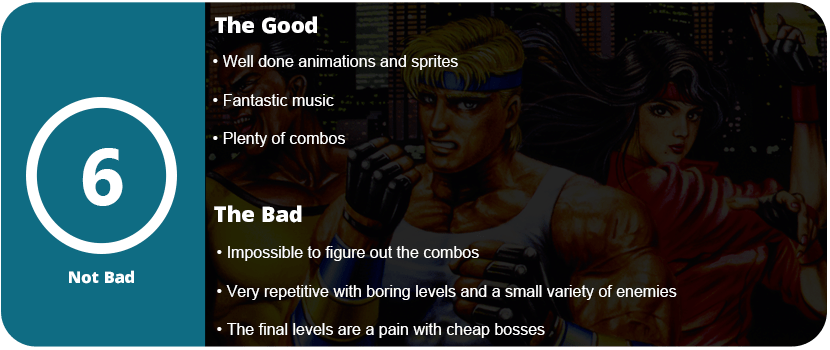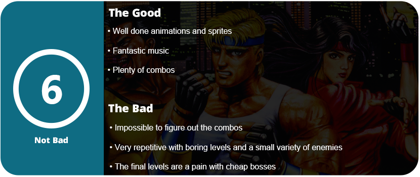 By the time you get to the eighth and final stage, you will feel burned out and done. If you somehow managed to survive, there’s not a lot of incentive to keep retrying, given how incredibly repetitive this game is. If combat and controls were more responsive or there was a dodge button, this would be forgiven. Even the screen-clearing special attack doesn’t help much, as you have to save them for bosses, and you don’t get many. Playing this game with another player significantly improves the overall experience. This game is not suitable for solo play.
