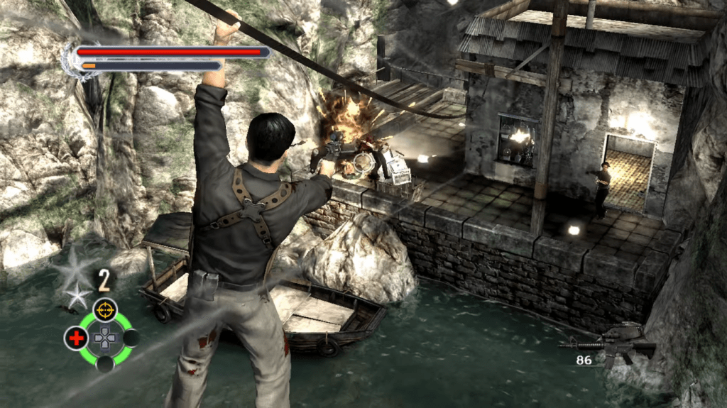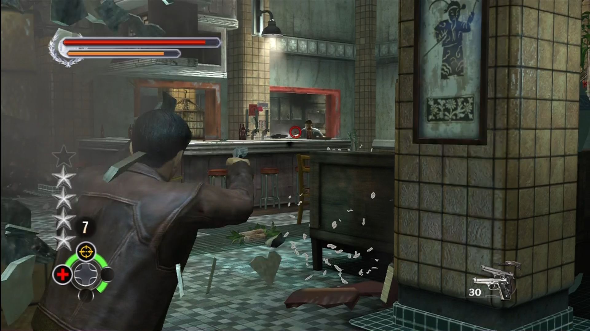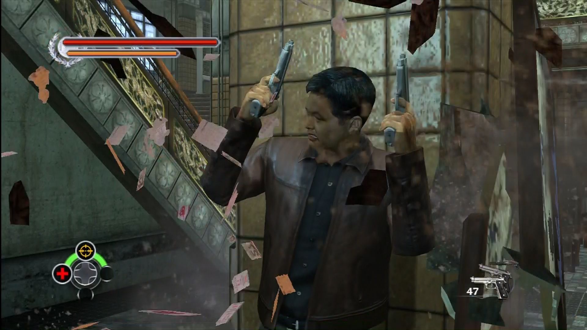 I remember when this game came out, it was pretty impressive on a technical level. We finally got an unofficial new Max Payne game. I say that because the entire game is incredibly shallow gameplay-wise. You get “Tequila Time,” which lets Chow use bullet-time just like in Max Payne. There’s a meter and everything. However, the difference here is using your environment as well. Certain objects, like rails, tables, and carts, will have a white line on them if you can mount them. This activates Tequila Time automatically but also gives you a score ranking and boosts your ability gauge. That’s as deep as this game goes. I’m not joking either. You unlock abilities during the first few levels. These allow you to sacrifice one of the four bars to heal, use a bullet cam that does extra damage, rampage mode that is a longer Tequila Time, and the last one takes four bars and eliminates all enemies in the area. These actually came in really handy for the most part. The bullet cam ability was great during boss fights, as a few of these and they were done.