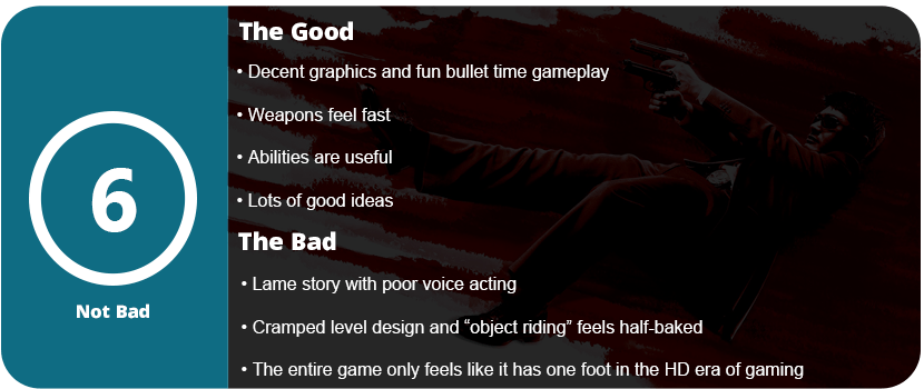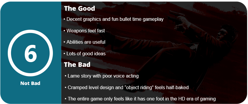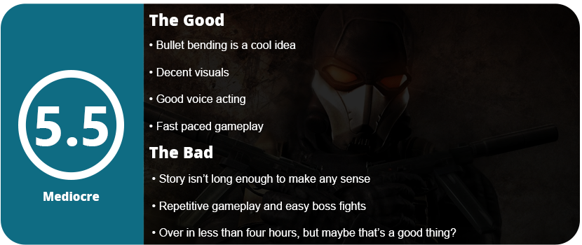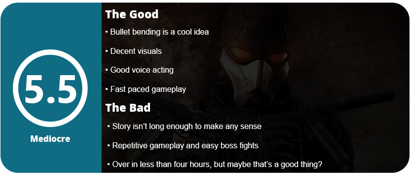 That’s all there is to the game. You just run around shooting, bullet-bending, and killing each wave as you push through the levels. Each chapter has an end boss that isn’t all that tough, but they’re there. You can eventually acquire your dad’s sub-machine pistols towards the end of the game and his suit. You go back and forth between the past and current times. The game is over in less than 4 hours, and you’re left with 4 hours you won’t get back. There’s literally no reason to play this game at all unless you’re super bored and want a decent afternoon with an HD-era shooter.
