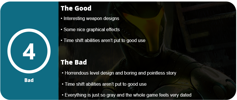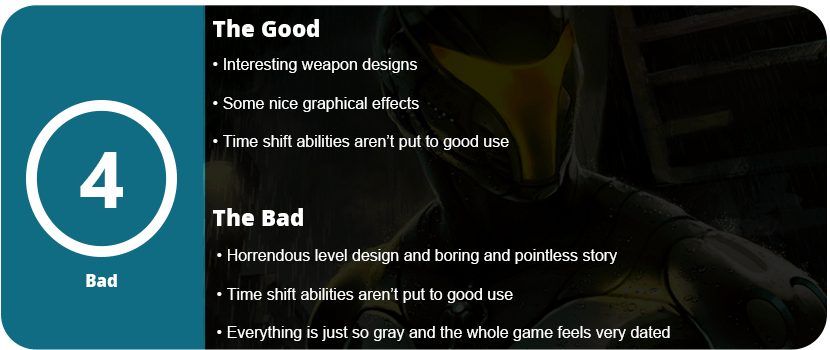 You play as some dude in a suit that can manipulate time. Wow, that sounds great, right? It’s not. Instead of giving you enemies that require a certain strategy or an ability to defeat or even puzzles, the game haphazardly throws boring, dumb, and generic soldiers at you, and you only have to use the time abilities because you die in a few hits, and there are just way too many of them at once. You will die a lot in this game, so quick saving is a must. Running through the open levels seems promising enough. The game shows some great visuals on a technical level anyway: some giant robot creatures, lots of allies running around, and a cityscape you must navigate through. This seems not too bad at first until you’re dumped into the next area. It’s just the same boring gray levels with boring generic warehouses throughout the entire game. Even the weapons and shooting can’t save this one.