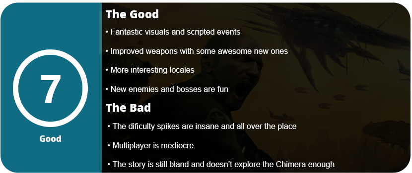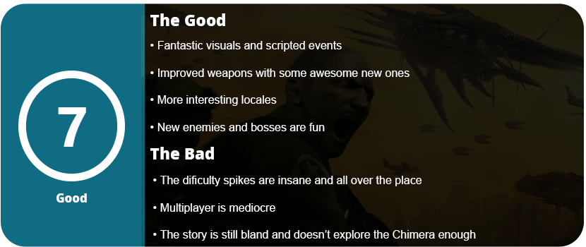 With the story being a toss-away, the gameplay has improved to some extent. There are more weapons, and this time around, you only get to hold two at a time instead of all of them. This makes you strategize your needs based on the current situation. Some of the original weapons return, such as the Carbine, Bullseye I and II, Fareye, Auger, and the Rossmere. However, the Auger has been improved by letting you actually see the enemies through walls this time. There are some new interesting weapons, like the Marksman with a secondary fire that shoots a plasma ball, and the Magnum, which has explosive rounds. The weapon arsenal is better than ever, and the aiming has improved as well. The weapons have weight, and the Chimera aren’t bullet sponges. They actually have animations to show they’ve been hit, and you can interrupt their shots.