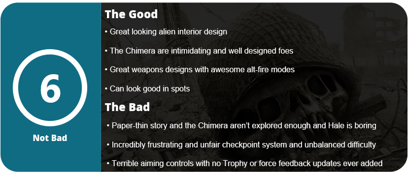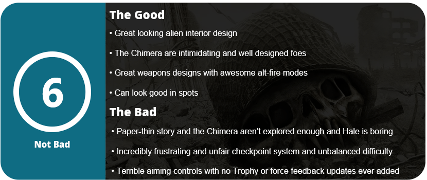 There are also a couple of grenade types, like the hedgehog grenade, which shoots out spikes, and an incendiary and explosive grenade. So with the weapons out of the way and explaining how awful it is to shoot them, the overall gameplay is insanely difficult, frustrating, and unfair. The checkpoint system is ridiculously unfair. Some levels only had a single checkpoint, and the game gets insanely hard fast. Some later levels I repeated about a dozen times until I remembered every enemy placement and knew exactly what weapons to use when. I also hate how the Chimera is just a bullet sponge. No one likes bullet-sponge enemies. This also leads to awful hit feedback from the enemies. Gears of War did this the best at the time. Animations that show the enemy is hit. The Chimera just stands there, and you have no idea if your bullets are connecting. Sometimes I would lay hundreds of rounds into one enemy, and it doesn’t help that all the guns are stupidly inaccurate, but the Chimera can hit you from across the map with no problem.