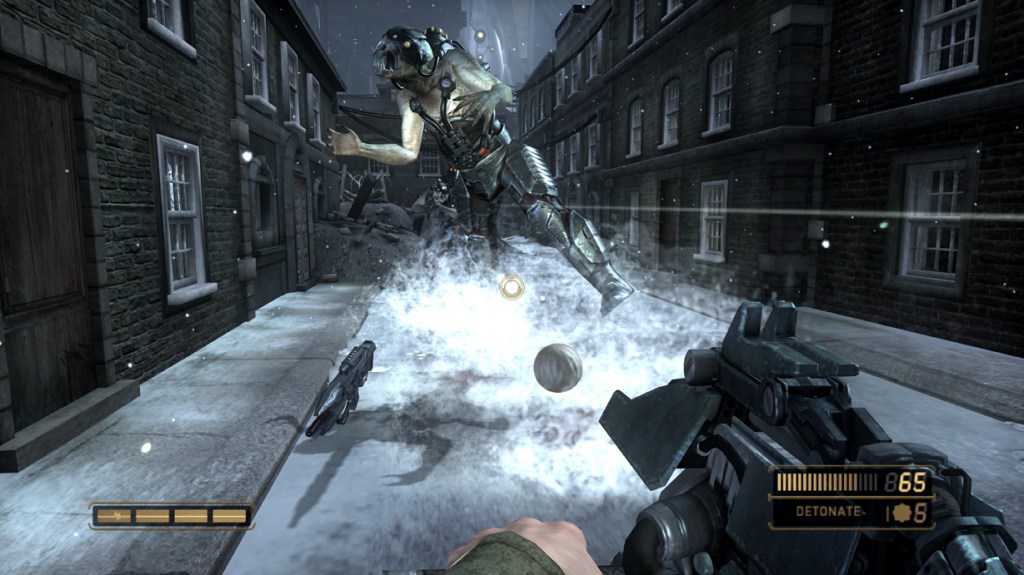 Let’s start with the setting and story, as Resistance has always had interesting enemies and plots, but Fall of Man does little to really show this in any way. The Chimera is an awesome foe. Similar to Locusts in Gears of War, these are the only enemies you will encounter. There are only a few types, but each type has been made carefully so you know what weapons to use in which situations. You play Nathan Hale, a typical generic white-bald dude with no voice who is somehow immune to the Chimera infection. He can regenerate health and survive situations most people can’t. The story is told in the past tense by an army officer, and the entire game takes place in England during WWII. I love WWII history, and this game had potential.