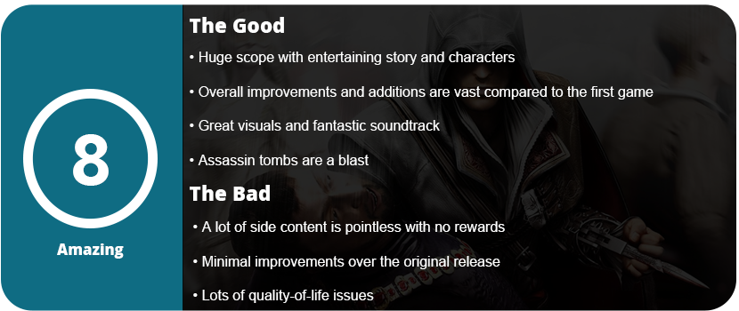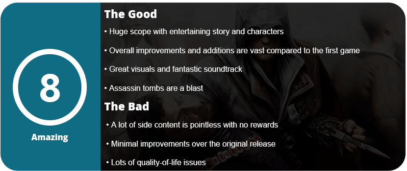The visual upgrade for the Ezio Collection is minimal. There aren’t any actual improvements outside of some draw distance gain, anti-aliasing, and texture filtering. The lighting is slightly improved as well, but not by much. The game runs incredibly well with no slowdown, but I did run into a few crashes and glitches. I wish we got a full remaster or remake, but what’s here is fine. It’s crazy how well this plays so many years later and just shows how far ahead the game was at the time. There are a lot of quality-of-life improvements that need to be made, and most of the core mechanics have frustrations you will need to forgive or work around, but the story and characters are worth sticking around for. There is also a lot of bloated side content that has no meaning or rewards, including fully upgrading your villa, which literally just generates more income and isn’t used for anything besides dying armor, buying weapons, and armor itself. The assassin and templar tombs are a lot of fun as well.