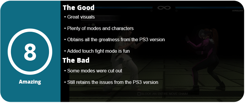 In addition to all this, you can use cross-save features and play online with other PS3 owners. While the content wasn’t cut, modes were such as not being able to upload matches to YouTube, lobby matches, and tag team solo play only. Despite those taken out, the game is solid and works well on Vita’s limited controls. I have to say this is one of the best fighting games available on the system, and any fighting or DoA fan should own it.