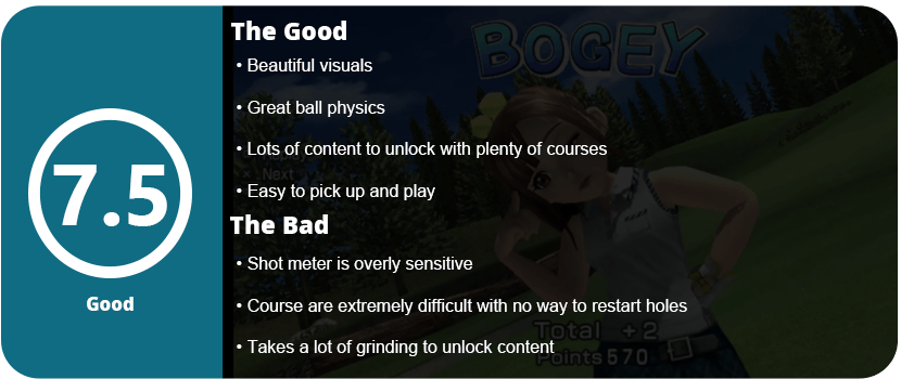 As it is, the game is nice to look at, easy, and fun to play. Grinding to unlock new items, upgrade your character, and not being able to restart holes makes this quite a frustrating game. The overly sensitive shot meter takes away from pure skill, and the courses are extremely hard to play right from the start. I can only recommend this to hardcore golf players, despite the audience this series normally aims for.