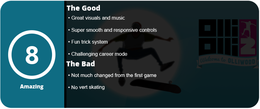 The game looks nice with fun music, awesome 2D scenes, and a great Hollywood/Los Angeles theme, and it’s just super smooth. With all that said, OlliOlli 2 is a great entry for newcomers and veterans who will find enough new stuff in the career mode to consider a purchase.