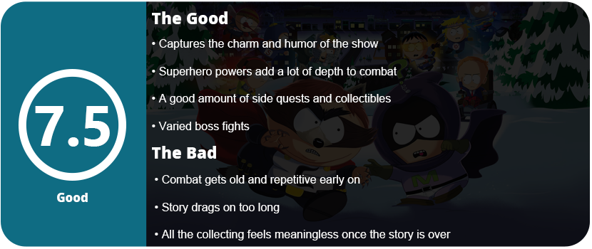 As the story progresses, the game feels dragged out. I feel there are many battles that are just there for fan service and don’t actually add to anything. The story is also similar to The Stick of Truth in that it’s nothing special and just feels like a typical South Park episode. That’s fine and all, but for a game, I wanted something a bit grander and more original. The game’s story relies too much on fan service and rehashing old story arcs from the TV show. Overall, The Fractured But Whole is a delightful superhero take on the formula but doesn’t do enough to advance the series or change much. If you didn’t like the last game, then this one won’t change your mind at all.