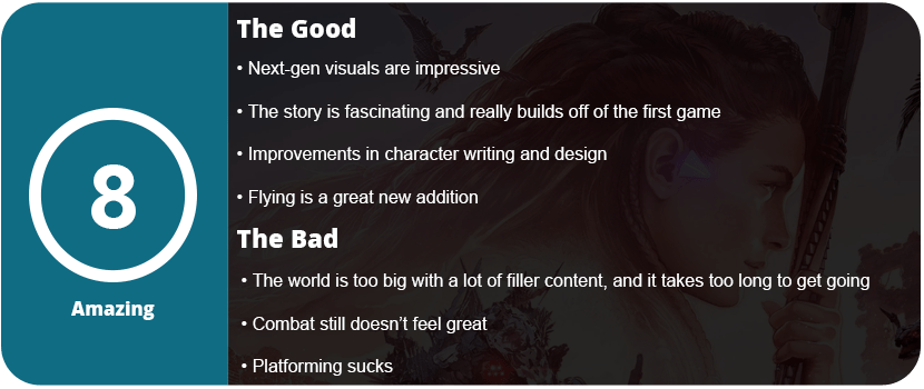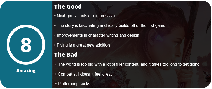The writing is much better this time around with less cringy dialogue and corny lines; however, the character design is still generic. All of Aloy’s allies are either just generic characters or have good writing and personality, but their looks are generic. For example, Alva is a great character in writing, but she still looks generic. Varl and Zo are forgettable, and Erand is a stereotypical biker personality who discovers he likes drinking and “Death Metal”. All of the miscellaneous characters who give side quests and errands are pretty generic. I just didn’t care for most of them. Some other characters are more decent, like Kotallo, who is missing an arm and is battling his honor. They have some great personality, and I could get behind them. It’s better, but not quite there yet.