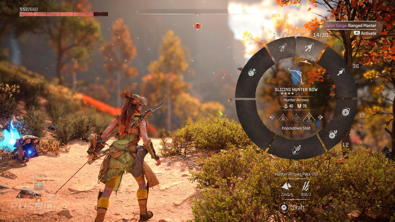 With the story out of the way, let’s dive into the combat. I still don’t love it. You’ll be dodging and rolling out of the way of these machine creatures. I feel there’s too much focus on ranged combat when most of the machines attack you up close. There is less stealth in this game and more up-close melee, but you still only have heavy and light melee attacks. If you sneak around, you can do a stealth kill, but you need to be at or above the area’s level to do instant kills. Humans are always instant kills, but machines not so much. There are many ranged weapons at your disposal that can set tripwire traps, semi-automatic arrows, long-range arrows, bomb slings, javelins, etc. These can all be equipped with coils that inflict various elemental ailments, such as corrosion to eat away at armor. The quickest way to take a machine down is to use your Focus to highlight weak spots and target those. You can slow down time (and this meter increases with various stat boosts), but I never felt in control of fights. Boss fights require tons of health potions and either having the right weapons or blasting them with everything you have. You can craft more ammo in the weapon wheel too.