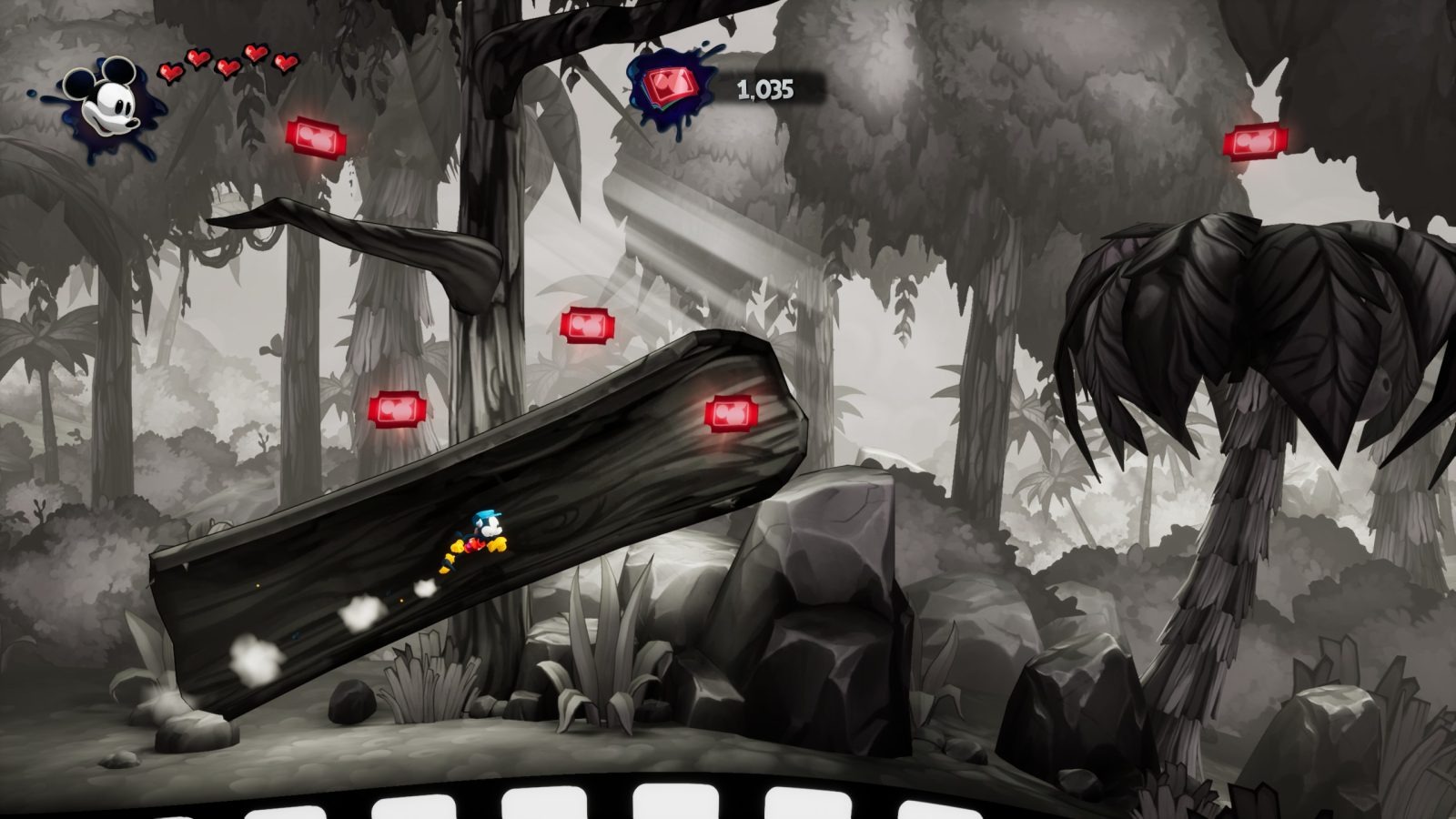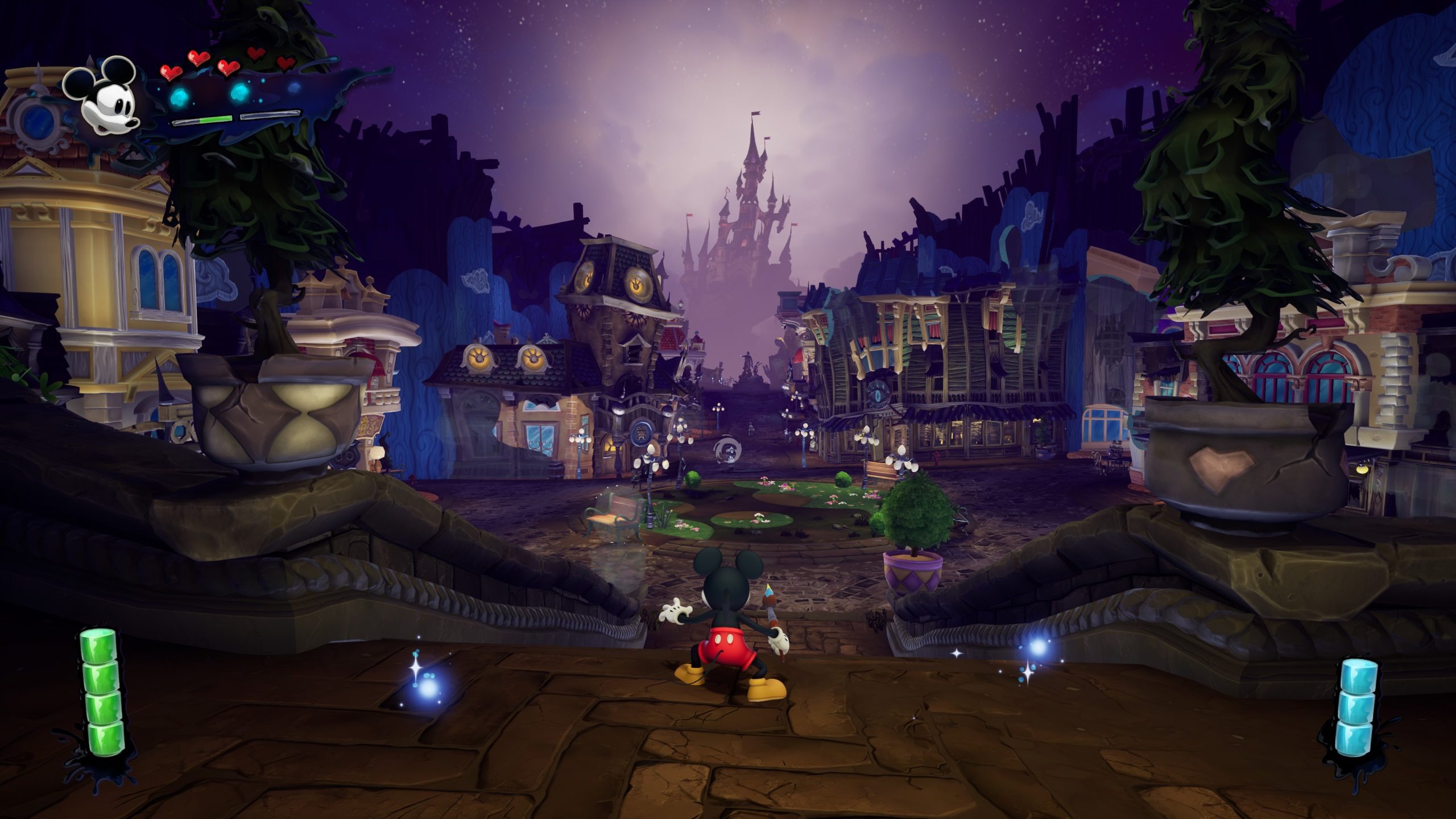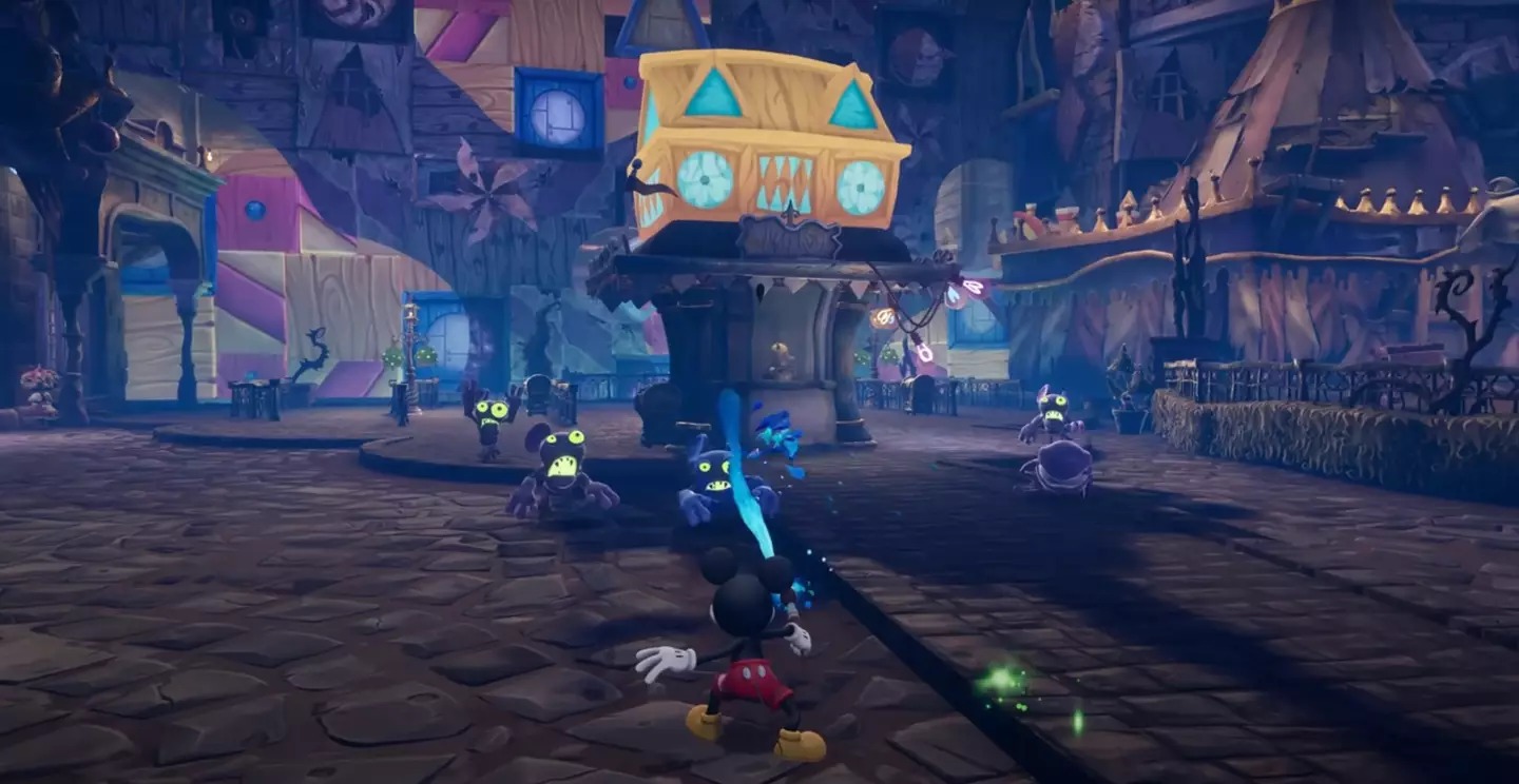 For the most part, Mickey’s momentum and physics feel good. He’s a bit floaty, especially in the 2D levels, but it works. Mickey can do a jump and slam move, a spin move, and a triple jump. The more advanced platforming sections present the biggest challenge in the game, but they also offer the most enjoyment. You can complete the 2D levels, which are transition levels, in around 30 seconds. Each level features concept art and two film reels. You use these to unlock items at the cinema, with approximately 64 available throughout the entire game. However, you only need half of these for the achievement, and permanent upgrades aren’t really necessary. Halfway through the game, you receive various items such as a TV to distract enemies, a clock to slow down time, and an anvil to crush enemies, among others. I never used these except on rare occasions, as combat is mostly avoidable. With the exception of a few puzzles and boss fights, I rarely used these.