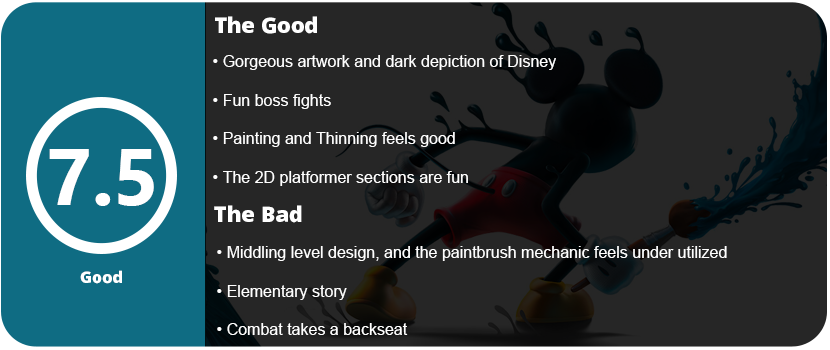 The visuals are fantastic, with some of the darkest for a Disney title to date. There are numerous melancholic landscapes in black and white, blending dark hues with sporadic bursts of brightness. Everything appears perilous and gloomy, yet it maintains a striking beauty. Unfortunately, most of the game’s content is forgotten much like its characters. Platforming takes precedence over combat, painting, and a cohesive level design. Only boss fights and a few puzzles provide occasional challenges. Navigating levels is a bit of a nightmare due to their haphazard design and layout. Purple Lamp did a great job fixing what they had to work with from the original game, but it needs more, and I doubt we will ever get it. The story isn’t even enough to bring the game up a notch or two, as it’s elementary and childish, which is in stark contrast to the tone of the entire game. It feels like a Saturday morning cartoon story that would put a toddler to sleep, which is a crying shame. Overall, it’s well worth a playthrough for platformer and Disney fans. If you hated the original, this might just be enough to change your mind.