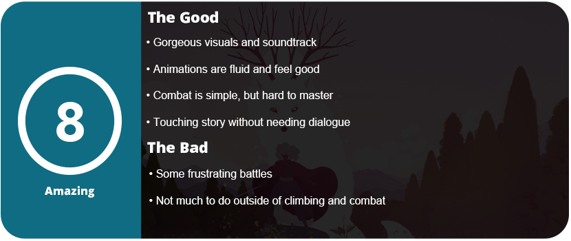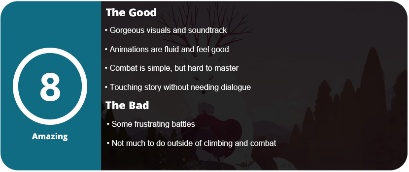 The game never becomes dull or boring because everything, including the scenery, is constantly changing. The game is absolutely stunning to look at with so much color and vibrant displays of black. Playing with an OLED screen is a must, as the colors pop and come to life. The game’s short duration of about 4–5 hours may turn most people away, but the sheer variety of what’s changed up with so few enemies and a simple gameplay loop is superbly done. I couldn’t put the game down, as I wanted to see these two succeed and find out what caused this blight in the world of Neva. The game and its characters are truly captivating, and I eagerly anticipate more.