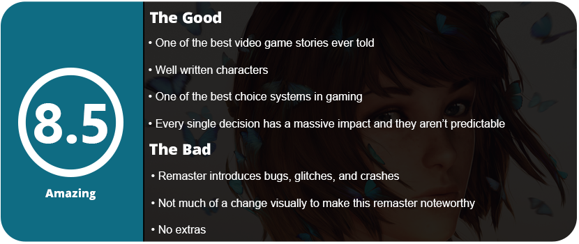 Overall, Life is Strange Remastered may not entice returning fans, but it’s an excellent option for those who are new to the game. The game is one of the best stories ever told, with some fantastically written characters, an amazing atmosphere and setting, and some of the best music ever composed.
