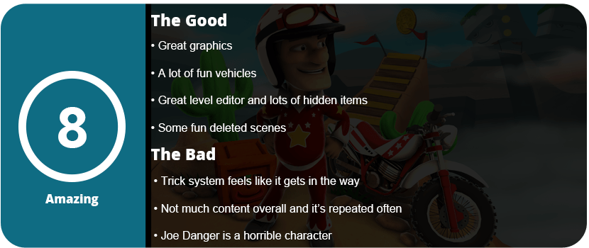 Overall, Joe Danger 2 is a fun motorcycle physics game and is perfect for people who think trials are too hard. There is enough content to justify the price, and there are plenty of hidden items to find for the completionist. The level editor is just icing on the cake. If the game wasn’t so easy, had too many unbalanced levels, and didn’t have too much repeated content, it could be so much more. The trick system feels like it gets in the way, and Joe Danger himself is a horrible character. Despite all that, this is a great game to relax with.