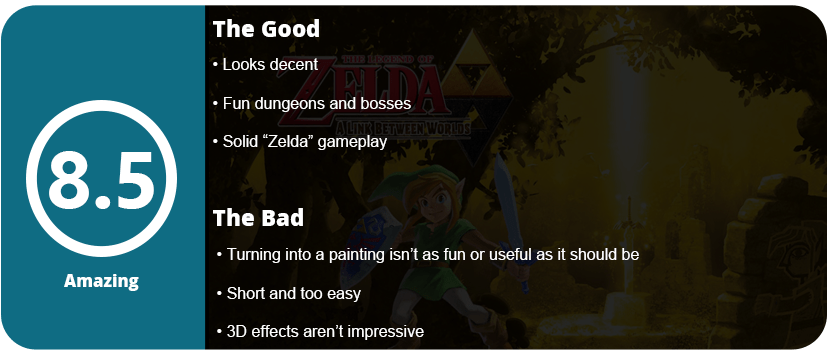 Overall, A Link Between Worlds is one of the best games available on 3DS and a fine Zelda game. It’s the only issue that it’s the same type of Zelda we have played numerous times, not the revolutionary Zelda we have come to expect from games like Phantom Hourglass. The 3D effects don’t really do much for the overall experience (like 99% of 3DS games) and can be just as enjoyable with the 3D turned off.