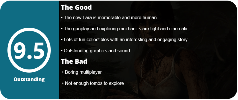 Overall, Tomb Raider is one of my favorite games of all time and is really memorable. The voice acting is solid, and Lara’s new personality makes her more human and more relatable. The graphics are outstanding, and the gunplay and exploring mechanics are fun and very cinematic.