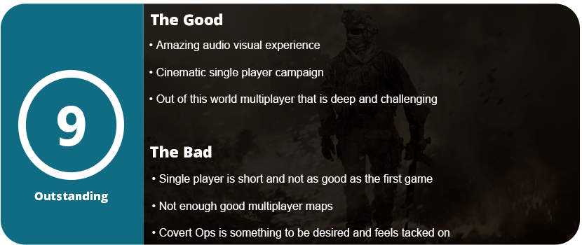 You also now have a customizable call sign, which is a placard that displays an emblem, a mockery banner, your rank, and your gamertag. There are dozens of emblems and titles to unlock, and mixing and matching is fun while the titles can match your personality, such as ones that say “Bow Down,” “Omnipotent,” “Joint Ops,” or “Voyeur.” There is just an endless heap of options in this game, and it truly makes it the best FPS multiplayer game ever made because there isn’t one thing I would want to change about the game. I really want to give this game a 9.5, but the slightly disappointing single-player and covert ops bring it down a tad.