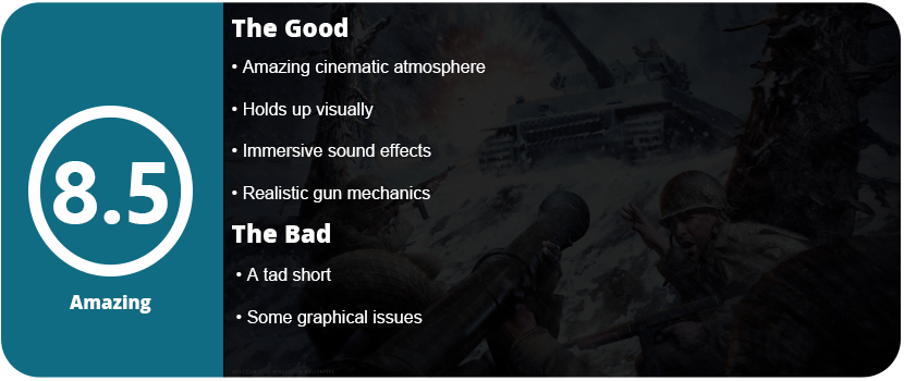 The game has three campaigns that run between America, England, and Russia. You play as three different faceless soldiers, but the environment is the main character here. Each campaign has an amazing opening scene as well as some memorable moments like the escape on a Jeep in the American campaign, the gripping plane scene in the England campaign, and the tank scenes in the Russian campaign. There is never a dull moment in Offensive, and everything from sound, great voice acting, and realistic-sounding war effects brings together a riveting experience that I truly have not found in any other WWII game (even in later CoD games).