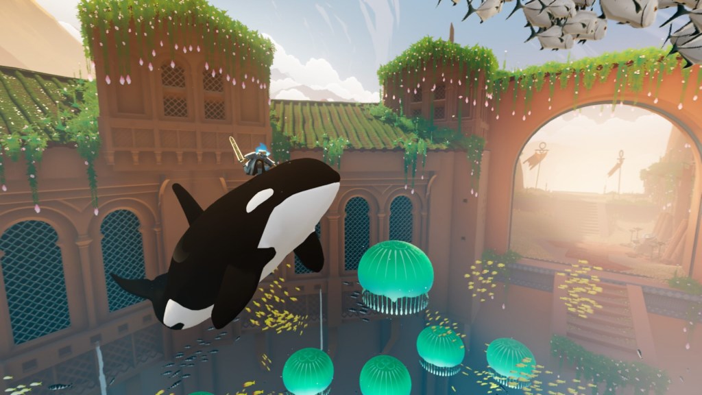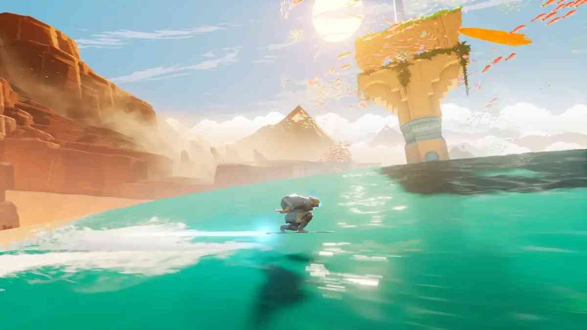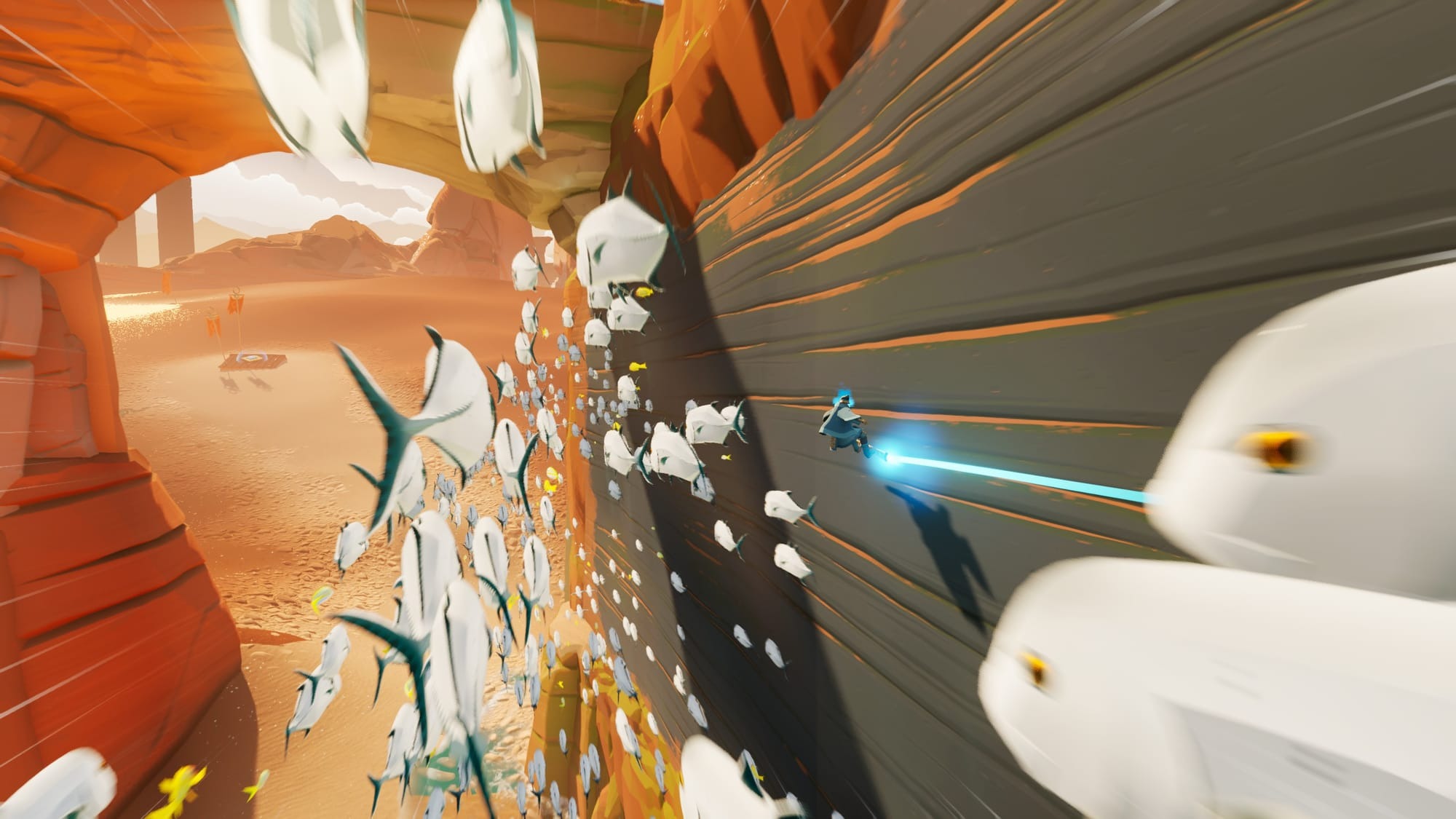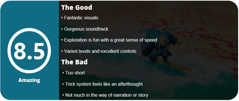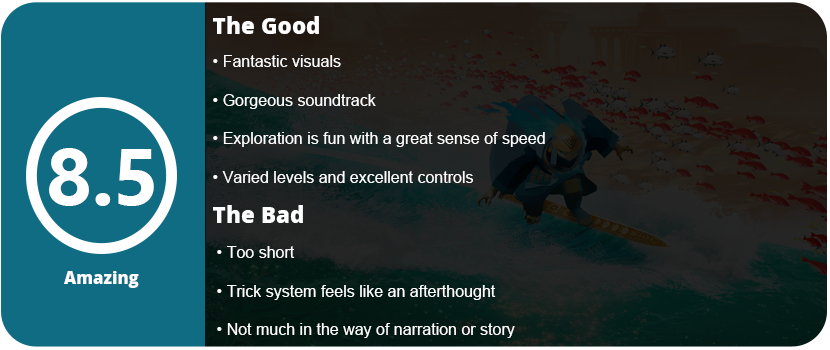 There are various environments, from deserts to actual seas, a volcano, a ghostly ocean, and underwater caves, and various others. These are massive areas that are so beautiful and well-designed. In between each stage are scripted linear areas in which you ride a sea animal at high speed. You can dive in and out of sand and ice like water while hitting lanterns to activate water bubbles to hydrate the area. These also include scripted cinematic moments that will make your heart leap. There’s an ice level that has you climbing a massive mountain and jumping off of ramps, and flying hundreds of feet is exhilarating and never gets old. Optionally, you can perform tricks with the face buttons. This includes wall riding, half-pipes, and anything you can jump from. The overall score is tallied at the end of the game. I feel the trick system is more of an afterthought and isn’t as elaborate as something in THPS as there are just four basic tricks. I honestly only did tricks for the four optional trick event areas, and they are incredibly easy. You just need 10,000 points. As long as you don’t touch the ground, you can keep your multiplier going by bouncing on jellyfish, wall riding, and boosting in the air.