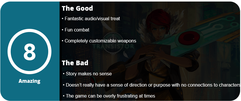 Bastion was a fantastic game with a memorable narrative and fast-paced combat. Transistor slows it down a bit with more strategic combat and a slightly less memorable story. The story is about love. The whole story never really makes sense; you’re just thrown in the middle of some battle between a woman named Red, a man named Grant, and a sect called the Camerada. I had no idea who this rebellious sect was, who Red was, or who Grant was. I guess that’s kind of the point. You’re in some sort of computer world, and the transistor is your weapon. A horde called the Process is trying to kill you.