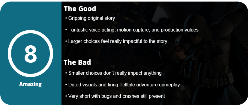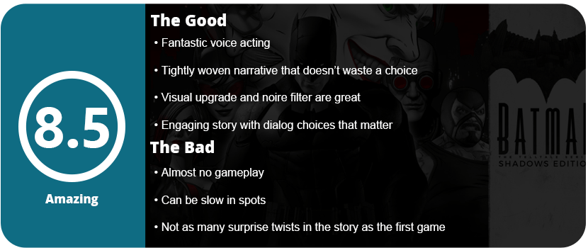 At the end of the day, we really feel like we know Batman, Alfred, Joker, and Harley all too well. Telltale did an amazing job of getting you inside their heads and making you really feel like you’re controlling Bruce’s fate and story. While the game is too light on gameplay and a little slow-paced, I couldn’t stop playing as I wanted to see what happened next. I really weighed my choices and felt that at the end, everything from the first game to the end of this one was satisfying and meaningful. This is clearly the best Batman game to play if you want an amazing story.
