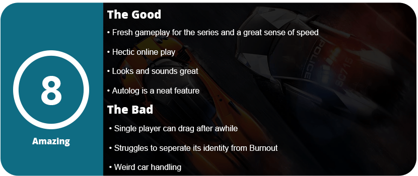 If that’s not enough, try the AutoLog recommended objectives or try to find and hit every billboard in the game. There’s a lot to do in this game, and even though it can feel repetitive after a while, there’s just a great sense of accomplishment from getting first in every race. Let’s talk about graphics. Most Wanted is one of the best-looking games on the Vita. The sense of speed is great, and the controls are amazing. It doesn’t look like the game took much of a hit from being downgraded graphically, but it was hand-tailored to the system. The game even sounds great, and I spent hours just racing around, completing races without ever getting bored. Is there anything bad about Most Wanted? Mainly how repetitive the races can get overall, but the variety of cars keeps this played down a bit. Crashing every 5 seconds can get annoying, but that’s expected. Most Wanted is a must-have racer for any system you can own it on.