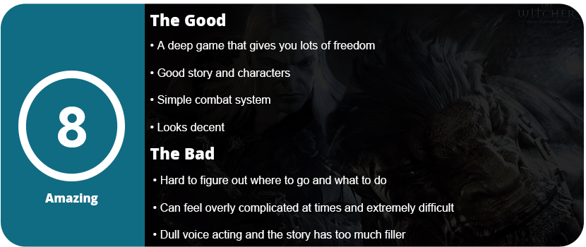 The game starts out fairly easy, but once it dumps into the world, it feels linear, and you don’t know what to do. There are a bunch of little annoying things, like you can’t see in a dark cave unless you drink a cat potion or carry a torch. A lot of the dialog is good, but the game is full of monotone voice acting. While the story is good, depicting a man named Geralt of Rivia, who is one of the last witches, trying to find a friend and kill an evil group called the Salamandra, it feels like there’s too much filler. The game is truly for the hardcore due to the open reign it gives players. The game looks pretty decent, but nothing close to next-gen, and it just feels a bit dated. For $20, you get a lot of games here, but some people may be lured in and quickly let down.