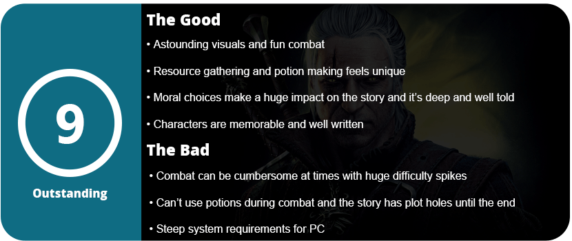 You play, once again, as Geralt of Rivia, a witch who got framed for assassinating King Demavend and must prove his innocence. The story is heavy on politics but is also very deep and feels just like the novels. Triss Merrigold also returns with her beautiful red hair and all. You will also see other familiar faces, such as Zoltan Chivay and Dandelion. The new faces are strong, likable, and memorable characters that you will grow to love or hate, respectively, throughout the course of this 20- to 30-hhour game. Geralt himself is even stronger this time around, with more problems than you can shake a stick at. You learn to respect him more and see just how much this poor man can take. CD Projekt really shows you the roots of both good and evil in humanity in such a realistic fashion, and that’s what really drives the characters home.