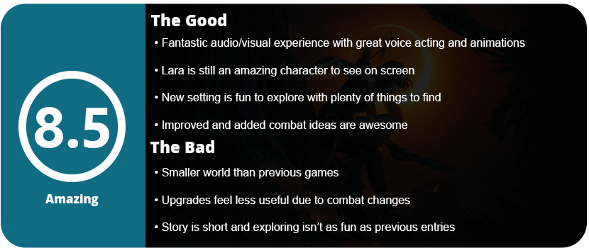 As it stands, Shadow of the Tomb Raider is a safe sequel that’s shorter and tries to cut corners and do less while dragging to gameplay ideas for a larger-than-life world with it that just doesn’t fit in. The combat has been greatly improved, but there isn’t much of it, the story is short despite being a better story than the last game, and the large open world is basically gone. What we get is a mix of the last two games, with some new ideas here for a new game. It’s the culmination of the best that all three had to offer, but just not enough of it. The graphics are out of this world amazing, with beautiful animations and voice work, but it’s just not enough to make it the king of the action-adventure genre again.