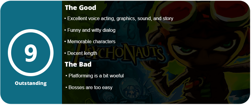 The story is charming, and so are the visuals. Cutscenes are played out like old silent films, and the game has a satisfying ending (remember, Double Fine doesn’t do sequels). The controls work just fine, and the mechanics are simple, but the execution has problems, from what I explained. The game itself can be beaten in just a few hours if you only find one solution for each area and skip everything else. Only completists will want to bother doing this. For the low price, you get a very unique game, but if you can’t look past these problems, then you won’t enjoy it.