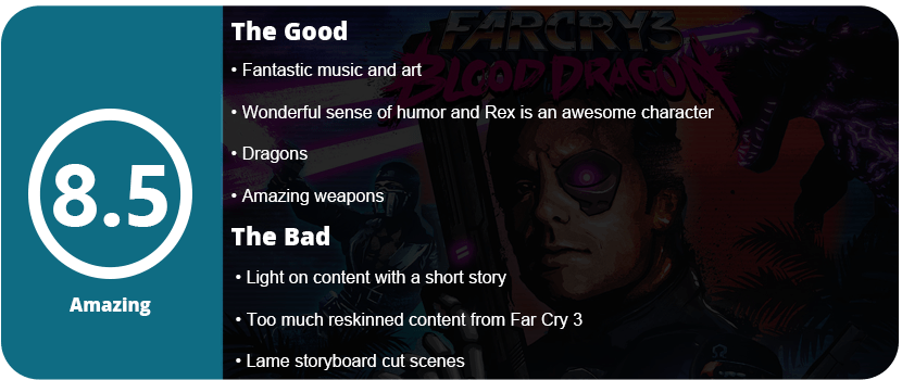 In the end, Blood Dragon is one of the best downloadable games this year and a completely pleasant surprise. Even if you don’t like Far Cry, the 80’s vibe should bring many hardcore gamers along. It’s light on content, the characters are average (except Rex), and the animations and art style are one-of-a-kind; there’s no other game out there like it. I really hope there’s a fully-fledged sequel, even outside of the Far Cry 3 engine.