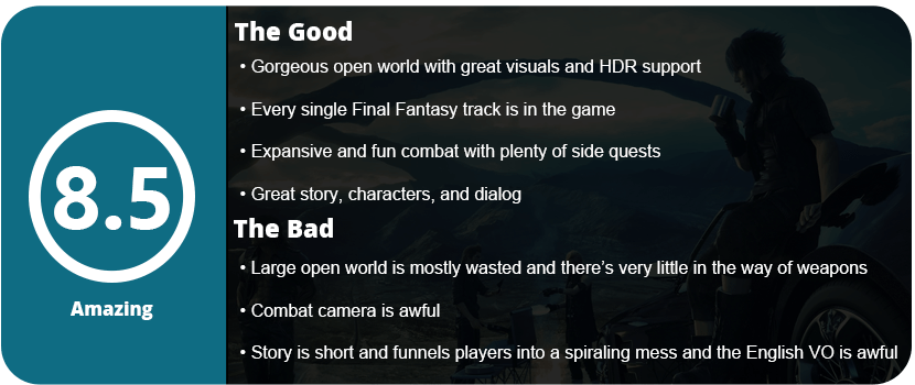 The visuals in the game are amazing, and the character models look great. This game supports HDR, and it looks gorgeous on a 4K TV, but there are some ugly bits, such as texture issues, and the NPCs aren’t as detailed as the main characters. While Final Fantasy XV is far from perfect, it’s also far from bad. If the camera was fixed in combat, there was more to do in this open world, and the story didn’t spiral into a linear, unbalanced mess, it could be the best FF game ever made. As it is, though, you will have to forgive the game’s shortcomings and learn to appreciate how far the series has come in 25 years.