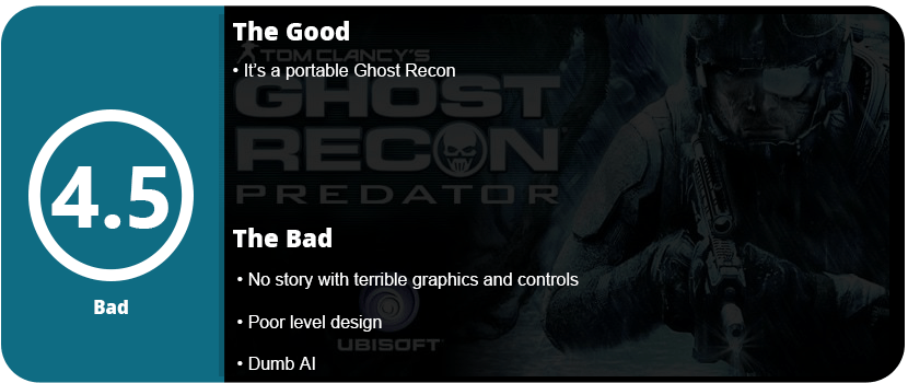 Ghost Recon has always been a great game, and Advanced Warfighter 2 was pretty decent on the PSP, but Predator is a complete disaster. To start, the controls are simply horrendous. Games like Syphon Filter and other third-person shooters have perfected controls on the PSP, so why not just borrow from them? The thing that breaks the game is the fact that you have to press X to go into aiming mode and then press X again to walk. So this makes the game a run-and-gun shooter since it gets so frustrating that you just hold L down to strafe and shoot your way through. Even using the cover system stinks, and it just feels like a crappy hack job by Advanced Warfighter.
