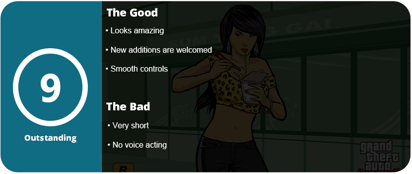 Overall, LCS is an incredible technical feat but is brought down by a mission structure not tailored for the handheld’s control system. It’s way too easy to die with missions that require sometimes dozens of enemies firing at you all at once, which leads to dozens of restarts and endless frustration. There’s a lot of slowdown and pop-in, and the radio stations start repeating after only a couple of hours, but that’s just the roughness of the original GTA open-world games. They weren’t perfect, but they were enjoyable thanks to their sense of freedom and great writing and character design. I recommend playing LCS, but keep the cheat sheet handy as you will need it since there are no difficulty options.
