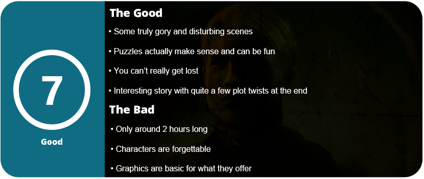 Once you complete a puzzle, you will usually see a small cutscene. There isn’t any combat in this game outside of the final boss. There are a couple of quicktime events, but for the most part, the game is mostly about atmosphere and storytelling. I was surprised at how complete the story felt despite the 90-minute run time. Without giving anything away, the ending took a surprising turn and provided a highly entertaining experience. The scares themselves are more jump scares. The sound of a screeching violin accompanies a shadow moving across the screen. The cutscenes have a few gory and gruesome shots that are super cool. The death scenes are also really gory. The music itself was just okay. The music lacked originality and bore a somewhat cliched feel. The theme was reminiscent of a haunted house, rather than being unique to this particular game.