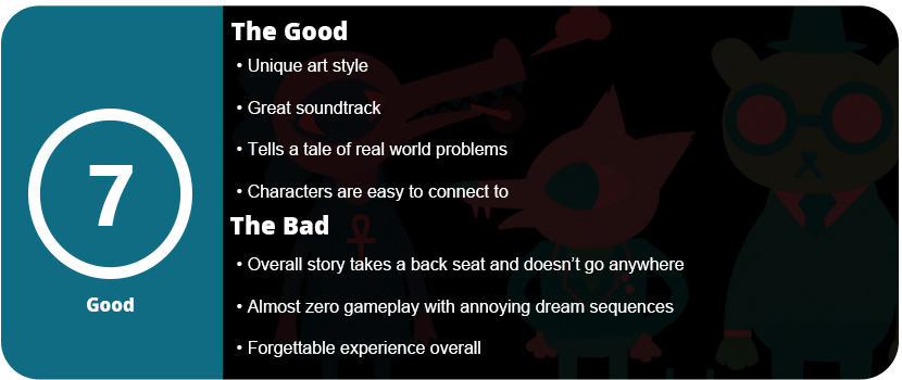 The actual relevancy of the title only comes into play during the last half-hour of the game, and it’s forgettable and almost feels forced compared to the day-to-day struggles of the characters, which are more interesting. I like how the game is written and the characters it portrays, but if you’re going to make this a game, actually give me a game to play. I started getting bored towards the end and just wanted the entire game to end.