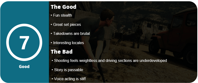 The stealth areas consist of sneaking around cover and meleeing guys and shooting them in the head without getting caught, or it’s going to be a firefight. This can be very satisfying when you learn the patrols and execute them accordingly. You can earn Focus Aim by doing a takedown, and this is just a one-shot kill, but you only get three. This comes in handy during stealth sections when you have multiple guys to take down in one area or are in a bind with your health.