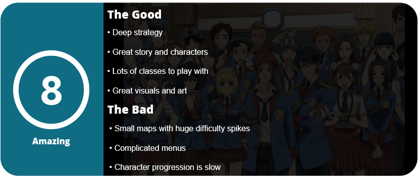 Outside the battlefield, you move around campus and talk to people to progress the story, but that’s pretty much all there is to it. The game looks really good with a nice anime art style, and the voice acting is decent but not amazing. The small map size will make fans of the PS3 original angry, but it’s perfect for a portable system. The game is pretty stat-heavy and menu-heavy, and the difficulty spikes may make you actually give up altogether. I couldn’t get past the second story-based escort missions due to the insanely powerful enemies, and you have to get the strategy down perfectly or it just won’t work out. Other than this, the game is superbly fun, and with about 40 hours of gameplay, you should be kept busy.