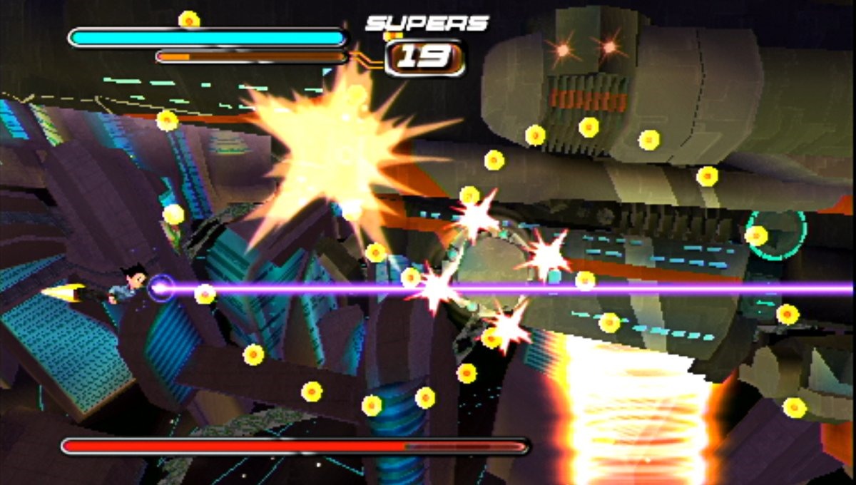Everything starts off great with Toby flying through the air using his laser, guns, and various other weapons. Killing enemies gives you orange orbs that charge your special meter, and these can be stacked up to ten. Using the latter moves using one of those bars, even healing. That sounds great and all, but the game relies on this way too much, and you deplete your special bars way too fast. Most of the enemies are hard to kill, even from the start, so what do you do? Use your laser or punch them. The problem with punching is that it’s slow and unresponsive since you can’t punch while moving. Once you hit the button, Toby stops dead, and you have to wait for the whole animation to play out. Not a very good thing in a fast-paced game at all. If you think that breaks the game, the jumping is even worse. Using a double jump makes Toby fly in one direction instead of just double jumping. Single-jumping is slow and pathetic, like you’re on the moon or something. This makes instadeaths constant and very frustrating.