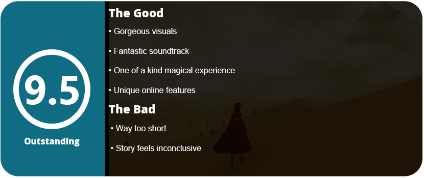 Everyone is so used to games with explosions, gore, death, and spoken dialog that we have lost touch with what games are truly designed for. There have been very few games that tell a story as a book or painting would, with no words and nothing but pictures. The only game that I feel comes close to Journey is Shadow of the Colossus. Games have the advantage of adding music and sound that are missing from books and paintings. Music and sound can trigger emotions in humans that no other type of stimuli can. Journey is one such game that uses only visual cues and sound to deliver a sad tale and a magical experience.
