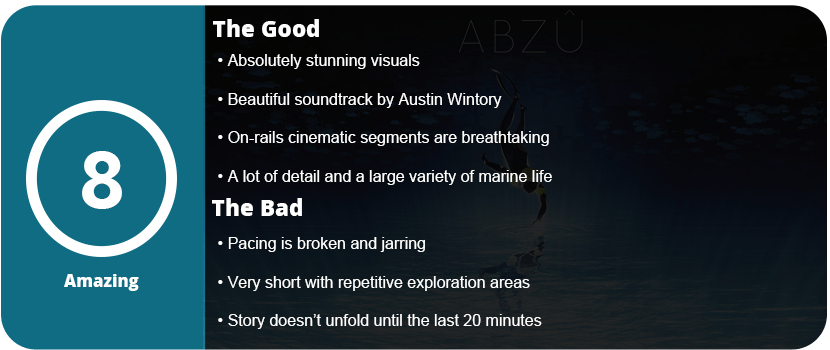 Overall, Abzu is a fantastic adventure game, and any fan of Journey must own it. The visuals are absolutely stunning, and Austin Wintory is back with another beautiful soundtrack—one of the best this year. It’s just a shame that the game suffers from poor pacing and exploration elements that are just there to force the player to look at everything. I feel like I’m getting my face rubbed in beauty rather than being allowed to soak it in as it passes by me.