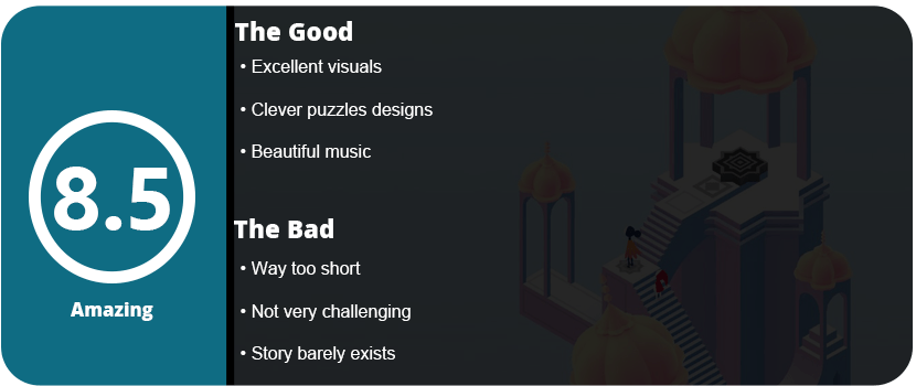 As it is, Monument Valley is a rare gem on mobile devices. It looks and plays beautifully, but the shortness will enrage people who fall in love with it.