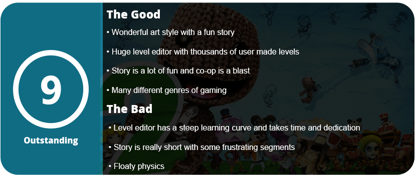 The controls are solid but feel a bit floaty and slidey, which is okay after you get used to them. One of my favorite features is Pop-It, which is a simplified menu you can bring up to place stickers in the world and customize your Sack Thing. If I were to really complain about the story mode, it would be that some sections are ridiculously difficult and require several restarts, but nothing you won’t get past. Once you beat the story mode, you can either play user-made levels or make your own. I won’t go into the level editor because it would take 10 paragraphs just to explain, and even then you would be confused. It is more simplified than the first game, but there is more to it, so it feels more complicated. I honestly could not build a single decent level, so I moved on to user-made levels.