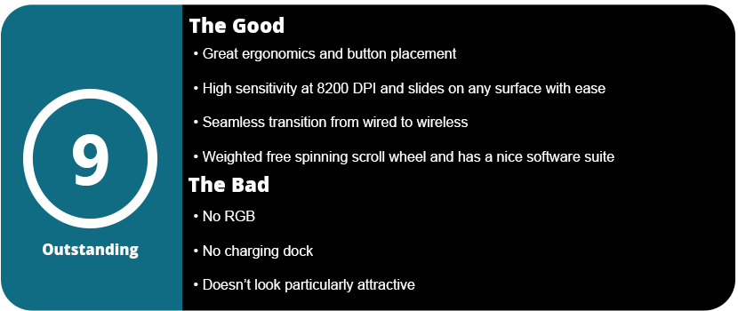 The performance is also the most flawless I have seen on any mouse. Going from corded to wireless is seamless, with zero hiccups, which are needed when your mouse dies in the middle of a game; it responded when my PC came out of sleep; and there have been no freezes, lag, hitches, or DPI drops like I have in Razer mice (three in total, by the way). The mouse can track up to 8200 DPI with a 1000 polling rate, perfect for people who love high sensitivity. I was able to adjust my DPI on the fly to adjust for different games, and I had no problems with the whole software or hardware.