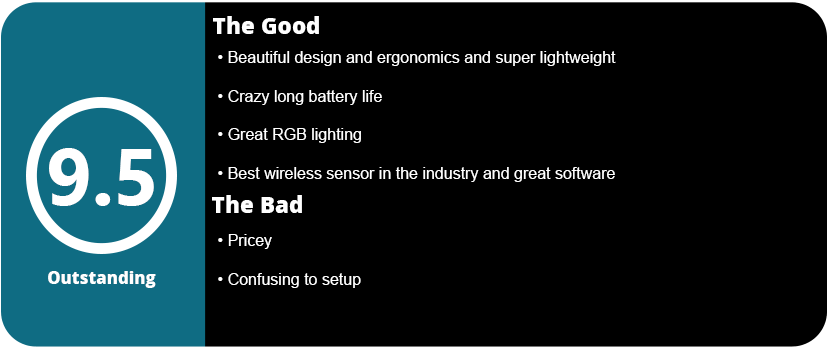 The battery life is just fantastic. I can actually use this from morning until night and still have a charge. With my other mice, I would have to charge them 3–4 times a day. With lighting all the way up, a polling rate of 1000 Hz, and using the sensor tracker, I get 22 hours. That’s damn impressive, if you think about it. I am highly impressed with their mouse pad tracker, as it’s so much better than Razer’s. You actually have to calibrate the mouse by moving it around your pad, and it detects what material and color it is as well as other variables. Razer’s tracking tech never worked and was awful and useless.