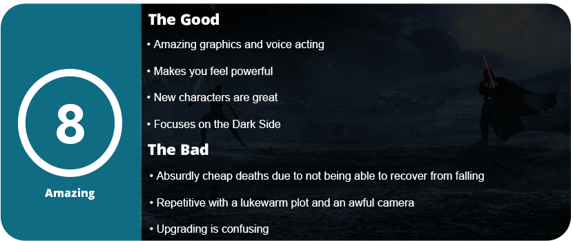 Overall, the game is a mostly frustrating and overly long affair. The game can take up to 8 hours to finish if you don’t die frequently, but the devs could have completely eliminated the first half of the game. It’s the weaker half anyway. The unfair checkpoints also don’t help; you have to restart entire long sections every time you die. There are a few fun moments, such as the boss fights and on-rails sections, and the platforming is more enjoyable than the puzzle-solving, but the generic visuals, paper-thin plot, and cumbersome controls and animations hold this game up quite a bit.